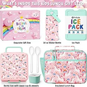 Fimibuke Kids Bento Lunch Box with 4 Compartments, Insulated lunch Bag, Stainless Steel Insulated Water Bottle, Ice Pack & Utensils Set, Birthday Gifts for Ages 3-12 Back to School Toddler Girls Boys