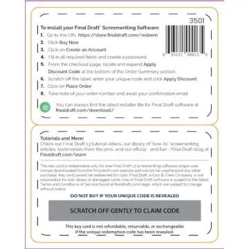Show more Unleash your storytelling potential with Final Draft 12, the premier professional screenwriting software trusted by renowned filmmakers like Guillermo del Toro, David Lynch, J.J. Abrams, and Sofia Coppola. Designed to empower writers, Final Draft 12 offers a dynamic and intuitive writing environment that seamlessly transforms your ideas into polished, screen-ready scripts. With its advanced features and tools, you can visualize your characters and scenes, enjoying unmatched freedom to create compelling narratives while ensuring the formatting aligns with industry standards.