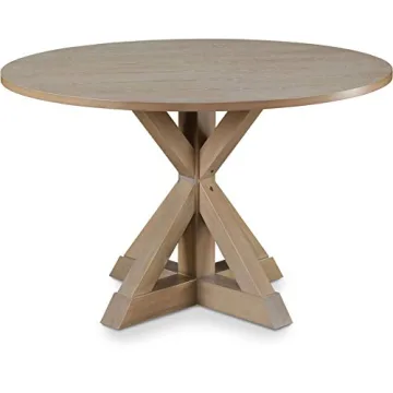 Show more Introducing the Finch Alfred Round Solid Wood Rustic Dining Table, your new favorite centerpiece that elevates any dining experience while effortlessly blending style and functionality. Expertly crafted from premium materials, this table showcases a rustic light wood finish, giving it a contemporary country charm that is sure to impress. With its unique trestle X-base, this table not only enhances elegance but also promotes a cozy atmosphere that comfortably accommodates up to four people. Ideal for small dining areas or eat-in kitchens, it seamlessly adapts to any space, making it the perfect addition to your home.