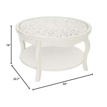 FINECASA Round White Coffee Table, 33.7x19 inches, Glass Top, Vintage Boho Design, Wood, White Patterned