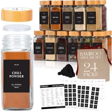 Elevate your culinary experience and declutter your kitchen with the FINESSY 24 Pack Empty Glass Spice Jars with Bamboo Lids. This enchanting set is not only a staple for every home cook but also a perfect blend of style and practicality, crafted by Finessy, a reputable small business in the USA. Each jar holds 4 oz of your favorite spices, elegantly encased in durable glass that promises longevity and aesthetic appeal. The standout feature of these jars are the airtight bamboo lids, which...