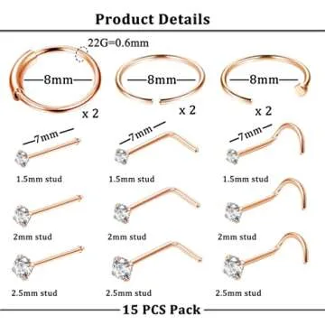 Show more Introducing the FINREZIO 15PCS Surgical Steel Nose Piercings set, where style meets versatility! This exceptional collection features 15 pieces of high-quality nose rings meticulously crafted from durable surgical steel, ensuring a hypoallergenic and safe option for sensitive skin. The set includes various gauges (22G, 20G, and 18G), enabling you to customize your piercing experience like never before. Enjoy a delightful variety of designs – from subtle studs to bold hoops – which cater to every personal preference and occasion.