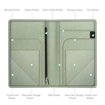 Fintie Server Book Organizer with Zipper Pocket, PU Leather Restaurant Guest Check Presenters Card Holder for Waitress, Waiter, Bartender (Sage Green)
