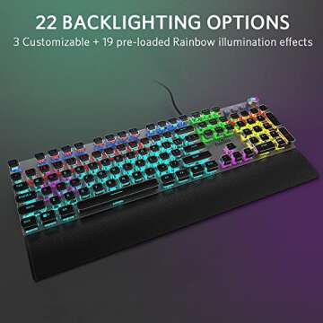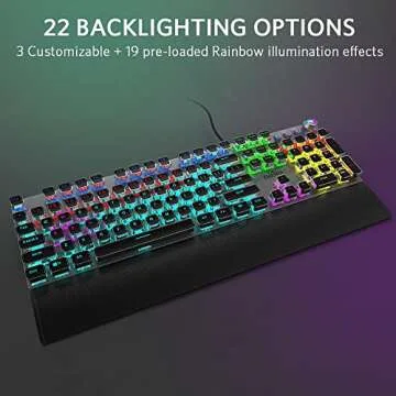 Embrace the immersive experience that the Fiodio Mechanical Gaming Keyboard provides. Transform your gaming or typing sessions with delightful feedback from the keys and customizable lighting options that not only elevate your home or office aesthetics but also create a personalized interaction with your devices. The comfort of the honeycomb wrist rest couldn’t be any more satisfying during intense gaming bouts, letting you focus solely on your performance. You’ll appreciate the peace of mind that comes with its durable constructions. Whether you're a gamer or a professional, this product offers hours of joy and productivity that you simply won't want to miss. Start creating your ultimate gaming setup today with Fiodio!
