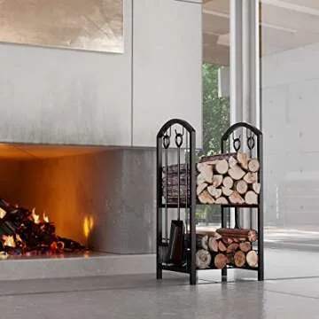 Fire Beauty Fireplace Firewood Log Rack 5-Piece Storage Logs Holder with Tools Set with 4 Tools Set Fireside Holders Wood Lumber Storage Stacking Black