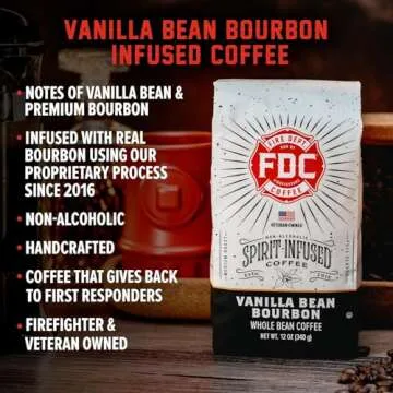 Show more Experience coffee like never before with Fire Department Coffee's Vanilla Bean Bourbon Infused Coffee. This ground coffee blend is crafted through a proprietary spirit infusion process, ensuring that each sip is enriched with a rich vanilla and premium bourbon flavor while completely devoid of any alcohol. Perfect for those who seek both delicious taste and a unique coffee experience.