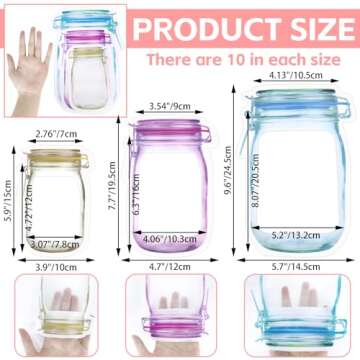 Show moreIntroducing the Fireboomoon 30 PCS Multi-Size Mason Jar Bottle Pattern Zipper Bags – the perfect blend of functionality and style for all your food storage needs! Crafted from high-quality PE plastic, these bags are not only durable, but also reusable and safe for storing various snacks and meals. With three convenient sizes – small (5.9" x 3.9"), medium (7.7" x 4.7"), and large (9.7" x 5.7"), each pack contains 10 pieces of each size, making it versatile for any occasion. Whether you're packing lunch for yourself or snacks for the kids, these bags ensure everything stays fresh while looking great with their charming mason jar design.