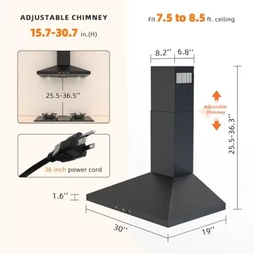 Show more Introducing the FIREGAS Black Range Hood - the perfect blend of style, functionality, and advanced technology for modern kitchens. With a robust suction power of 450 CFM, this wall-mounted range hood swiftly eliminates smoke, grease, and unpleasant odors, ensuring that your cooking space remains fresh and pleasant. Designed with energy efficiency in mind, this appliance not only elevates your kitchen aesthetics but also helps keep your energy bills in check. Its sleek black painted stainless steel construction ensures resistance to stains and corrosion, making it a durable addition to your culinary environment.