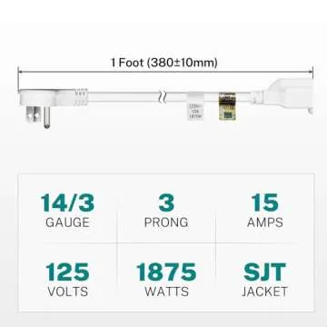 Show moreIntroducing the FIRMERST 1875W Low Profile Flat Plug 1Ft Extension Cord, the perfect solution for all your power needs in tight spaces. Engineered to meet the highest standards of safety and performance, this heavy-duty extension cord features a robust 14 AWG wire that supports up to 15 Amps and a maximum of 1875 Watts, making it incredibly reliable for all your household devices. With its unique flat plug design, you'll have the flexibility to plug it into top outlets without blocking the bottom, ensuring you can maximize your outlet usage while keeping your space tidy.