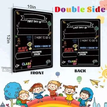 Show more Capture the precious moments of your child's educational journey with our First and Last Day of School Chalkboard Photo Prop. Measuring at a perfect 10" x 12", this double-sided chalkboard is expertly crafted from sturdy wooden material, ensuring it stands the test of time through countless school years. Each side of the board is designed with a blank space that invites customization, allowing parents to document their child's name, grades, and personalized messages for both their first and last days of school. This makes it not only a delightful addition to any school year but also a unique keepsake that can be cherished for years to come.