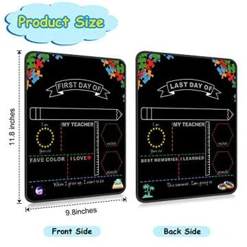 Show moreCelebrate the journey of learning with the First Day of School Board, a beautifully designed, double-sided chalkboard that commemorates both the first day and last day of school. Perfect for children in preschool through 12th grade, this engaging board offers a memorable way to capture precious moments as kids start each school year and wrap it up with a celebration. Measuring 10"x12", it is crafted from high-quality, environmentally friendly hardwood, making it sturdy and long-lasting. The vibrant colors and playful design spark enthusiasm and joy, ensuring a delightful back-to-school experience for your child.