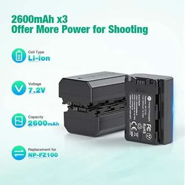 Show moreIntroducing the FirstPower NP-FZ100 Battery 3-Pack and Triple Slot Charger, your ultimate power solution designed specifically for Sony’s advanced camera models such as the Alpha A7 III, A7 IV, A7R III, A7R IV, A7R V, A7C, A7S III, A9, A9 II, and A6600. This bundle includes three high-capacity 2600mAh NP-FZ100 batteries that ensure you’re always ready to capture stunning photos and videos, no matter where your creativity takes you. With the capability to shoot longer and shoot more, you no longer need to worry about missing important moments due to low battery life.