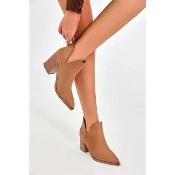 Show moreStep into style and comfort with the FISACE Womens Pointed Toe Stacked Mid Heel Ankle Boots. These chic ankle booties are designed for the modern woman who values both fashion and functionality. Crafted from high-quality faux leather, they feature a striking pointy toe, an elegant side deep V cutout, and a chunky stacked heel that elevates any outfit while ensuring all-day comfort.