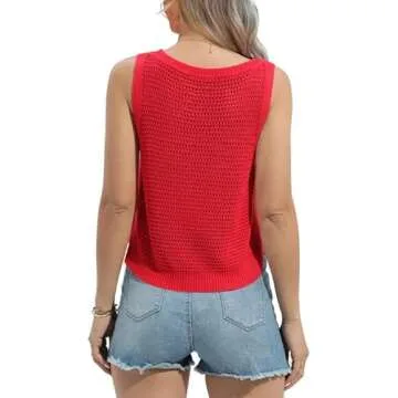 FISACE Womens Summer Knit Sweater Tank Tops Round Neck Crochet Hollow Out Sleeveless Casual Crop Shirt Red