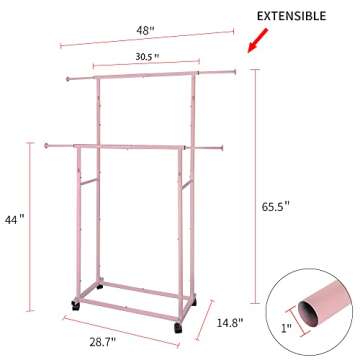 Show moreDiscover the perfect blend of functionality and style with the Fishat Pink Simple Standard 2 Double Rod Clothing Metal Garment Rack. This versatile garment rack is designed for the modern home, providing extra hanging space with its unique extendable top rod that ranges from 30.5" to 48". Constructed using premium metal tubing, it's not only durable but also elegantly designed to enhance any room's decor. Whether you're hanging clothes for easy access or creating an organized showcase for your fashion essentials, this rack is a wonderful solution that adapts to your needs.
