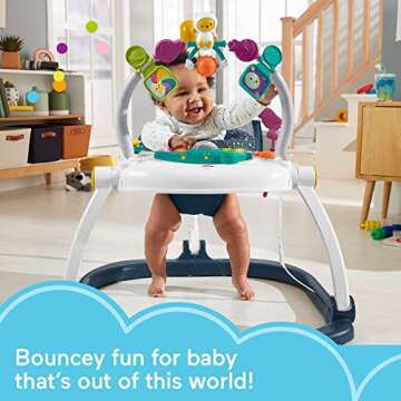 Introducing the Fisher-Price Baby Bouncer SpaceSaver Jumperoo, the ultimate activity center designed for infants ready to explore their bouncing potential! This innovative ~~jumperoo~~ combines stimulating music, engaging sounds, and a vibrant "command center" that brings joy to every play session. Made with a sturdy free-standing frame, this bouncer ensures safety without needing to rely on doorway installations, giving you peace of mind.