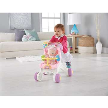 Show moreIntroducing the perfect companion for your little one’s early walking adventures! This delightful push-along pretend stroller, brought to you by Fisher-Price, is designed with the active toddler in mind, featuring enchanting music and captivating sounds that play as your baby walks along. The unique design encourages exploration and movement, providing both fun and functional support as babies learn to walk. Imagine the joy on their face as they stroll through the house with their favorite doll or stuffed animal in tow!