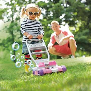 Ideal for outdoor fun, this innovative mower blows bubbles