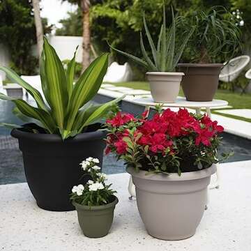Show moreIntroducing the Fiskars Bloem 20-56908 8 Inch Ariana with Self-Watering Grid in an elegant black finish—an ideal solution for all your indoor and outdoor gardening needs. This sleek planter combines functional design with style, measured perfectly at 8.75 in. top width x 5 in. bottom width x 7 in. height. It boasts a capacity of 1 gallon, making it a practical choice for a variety of plants. What truly sets this planter apart is its built-in self-watering disk, which stores water to be absorbed by your plants when they need it most, ensuring they thrive even when you're busy. Additionally, the planter’s sealed bottom prevents leaks indoors, allowing you to keep your home clean and dry.