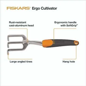 Fiskars Ergo Cultivator for Digging, Aerating Soil, and Weeding, Heavy Duty Garden Tool with Hanging Hole