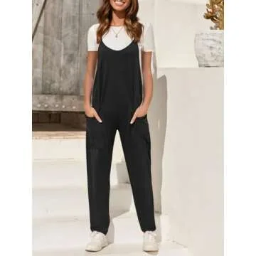 Show more Experience the ultimate blend of comfort and style with the Fisoew Women's Summer Sleeveless Loose Casual V Neck Jumpsuits! Crafted from a premium mix of cotton, polyester, and spandex, these jumpsuits promise a lightweight, breathable fabric that hugs your body perfectly while allowing for freedom of movement. The trendy v-neck and spaghetti straps create an effortlessly chic look, making it the perfect outfit for a variety of occasions—from beach outings to casual dates. With a relaxed fit design, oversized patch pockets, and an adorable back zip pocket, you'll find this piece not only fashionable but exceptionally functional as well.