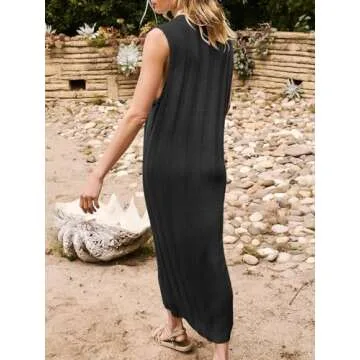 Fisoew Women's Summer Sleeveless Maxi Dress Scoop Neck Ribbed Knit Tank Top Dresses Black