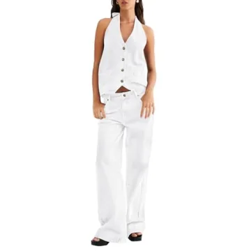 Introducing the Fisoew Women's Two Piece Denim Set, a stylish ensemble designed for the modern woman who values both comfort and fashion. This chic outfit features a button-down backless tank top paired with wide-leg jeans, creating a trendy and coordinated look that's perfect for summer outings and casual events. Crafted from high-quality 100% cotton denim, the fabric is not only soft and breathable but also sturdy enough for long-lasting wear. With its slight stretch, this outfit ensures...