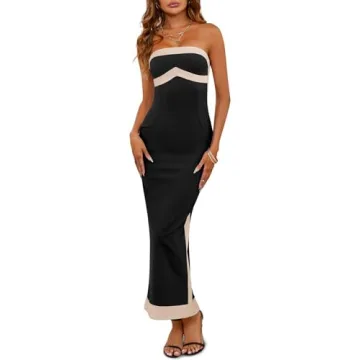 Step into elegance with the Fisoew Womens Strapless Bodycon Party Maxi Dress, the ultimate choice for every fashionable woman seeking to make a statement. This exquisite strapless dress combines a sexy off-shoulder design with a stunning contrast color, perfectly tailored to accentuate your curves and boost your confidence. Crafted for the modern woman, the form-fitting silhouette is both flattering and comfortable, designed to hug your body in all the right places. Its chic high slit allows...