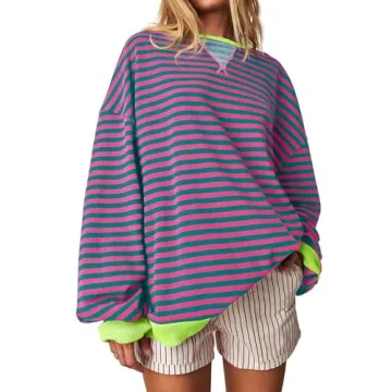 Show more Introducing the Fisoew Women's Striped Oversized Sweatshirt – the perfect blend of comfort, style, and versatility that every modern wardrobe needs! Crafted from a high-quality cotton blend, this oversized crew neck long sleeve shirt is designed to be soft, stretchy, and breathable, making it the ideal companion for all-day wear across Spring, Summer, and Autumn seasons. The fun and trendy color block striped design not only gives it a youthful vibe but also captures the essence of the Y2K aesthetic beloved by so many. With its ribbed neck, cuffs, and hem, you’re guaranteed a stylish yet comfy fit every time you wear it.