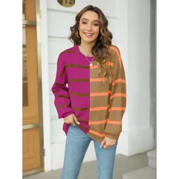 Fisoew Womens Striped Pullover Sweater Crew Neck Long Sleeve Knitted Color Block Casual Loose Lightweight Sweaters for Women