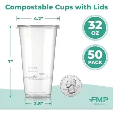 Show more Introducing the ultimate solution for eco-conscious beverage enthusiasts: the Fit Meal Prep 50 Pack 32 oz Compostable Clear Cups with Flat Lids. Designed with the environment in mind, these cups are crafted from 100% food-safe, plant-based materials, ensuring a guilt-free choice for your drinkware needs. Perfectly suitable for parties, picnics, or everyday use, these cups combine durability and functionality without compromising our planet's health.