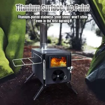 Show moreIntroducing the ultimate companion for outdoor enthusiasts—the Fitinhot Camp Wood Stove, designed with an upgraded titanium surface that offers unmatched durability and functionality. Perfect for cozying up your camping experience or providing essential heat in off-grid shelters, this portable wood-burning stove is as versatile as it is efficient. Weighing just 15.43 lbs, transporting it to your next adventure is a breeze. Additionally, the thoughtful design allows for a seamless cooking experience with a flat cooking top, dual side shelves for convenience, and a mesmerizing glass window to keep an eye on your flames without letting the heat escape. This camping companion is not merely about practicality; it transforms your tent or outdoor area into a warm and inviting space.