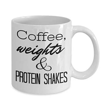 Fitness coffee mug - Coffee, weights & protein shakes - gift for weight lifter, personal trainer, gym rat