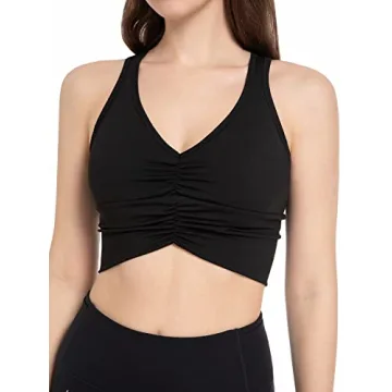 FITTIN Women Shirred Front Sports Bra Padded Racerback Yoga Crop Tank Top with Removable Pads Longline Workout Bra Black