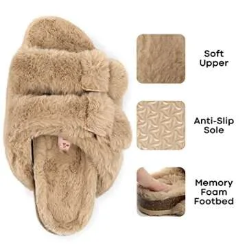 FITVALEN Open Toe Fluffy Slippers, Slippers with Arch Support for Women Adjustable Fuzzy House Slippers Cozy Cork Buckle Sandals with Faux Fur Lining for Indoor Outdoor(Camel, 8)
