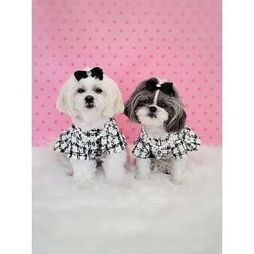This one-piece outfit features a stunning black and white plaid design embellished with golden silk accents, ensuring your furry friend will truly shine at any gathering. With meticulous attention to detail, this dog dress includes a button-up closure for added sophistication and a secure fit. The soft fabric ensures your pet has a gentle embrace, making it suitable for various activities like leisure walks, dates, vacations, and everyday outings.