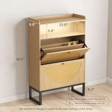 FiveWillowise Shoe Storage Cabinet, Rattan Shoe Cabinet with 2 Flip Drawers & Sensor Light for Entryway, Narrow Free Standing Shoe Racks for Entryway, Hallway, Natural