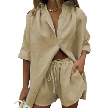 Show more Introducing the **Fixmatti 2 Piece Outfits for Women Summer Two Piece Blouse and Shorts Set**, your new go-to choice for a stylish yet comfortable ensemble! This chic set includes a versatile **half sleeve button down shirt** crafted with a **V neck** and a **turn-down collar**, ensuring you not only look great but feel at ease all day long. The **loose fit** of the shirt offers a relaxed vibe, making it perfect for your casual outings or daily work, all while exuding fashionable flair.