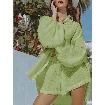 Show moreIntroducing the Fixmatti 2 Piece Summer Shorts Set, a must-have for every stylish woman seeking comfort without sacrificing fashion. Crafted with premium lightweight linen, this casual shorts and shirt combo offers the ideal balance of breathability and chic style. The set features a button-down shirt with sophisticated lantern sleeves and a high-waisted shorts design, making it perfect for a variety of occasions, whether you're lounging at home or exploring a sunny beach destination. Choose the lovely Light Green shade to exude a refreshing elegance during the warm summer months.