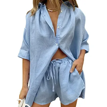 Fixmatti Lady Shorts Set Two Piece Outfits Button Down Top and Shorts Blue
