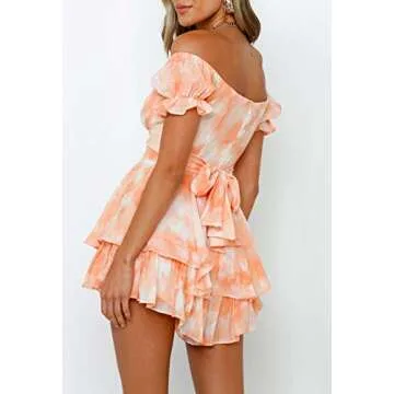 Fixmatti Women Bohemian Tie Dye Cold Shoulder Chiffon Jumpsuit Ruffle Shorts Colorful Playsuit Orange S