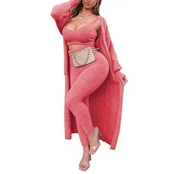 3 piece fleece set,crop tops+long pants+long cardigan lounge set
