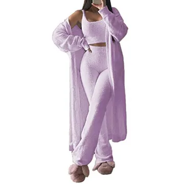 Show moreIndulge in unparalleled comfort and contemporary style with the Fixmatti Women Lounge Set, an exquisite **3-piece fuzzy fleece pajama ensemble** designed specifically for the modern woman. This chic collection includes a **sexy sleeveless tank crop top**, **high-waisted wide-leg pants**, and a fashionable **open-front cardigan coat**. Crafted from premium quality fleece, each piece is incredibly soft to the touch and provides the warmth you crave without sacrificing elegance. You'll feel cocooned in luxurious comfort while looking effortlessly stylish.