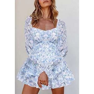 Fixmatti Women's Casual Boho Long Sleeve Romper Floral Printed Ruffle Chiffon Shorts Jumpsuit Playsuit Blue M