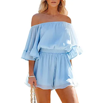 Fixmatti Women's Summer Romper Off Shoulder Flared Sleeve Jumpsuit Light Blue S