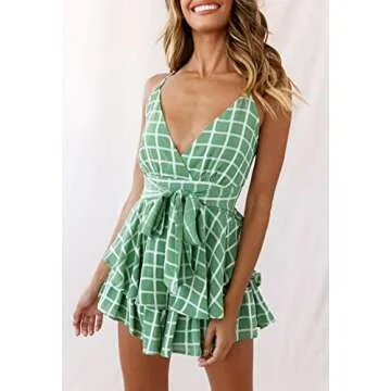 Fixmatti Women Stripes Romper Spaghetti Straps V Neck Bare Back Belted Chiffon Shorts Jumpsuits Green S