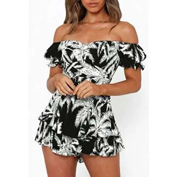 Show more Elevate your summer wardrobe with the stunning Fixmatti Women's Tropical Playsuit. This chic off-shoulder jumpsuit combines effortless style with bohemian flair, featuring a vibrant floral print that captures the essence of tropical adventures. The sexy boat neck design and cold shoulder cutouts create an alluring silhouette, while the self-tie knot adds a playful touch. Crafted from lightweight chiffon, this romper offers breathability and comfort, making it perfect for warm-weather outings. With a convenient zip-up back and high-waisted shorts, you will feel both secure and stylish no matter the occasion.