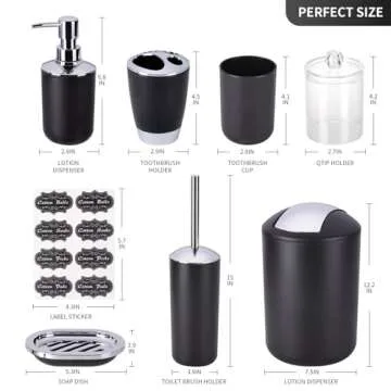 Transform your bathroom into a modern oasis with the Fixwal Bathroom Accessories Set—a comprehensive 8-piece collection that combines functionality and style. This set includes all the essential pieces you need for a clean and organized space: a sleek trash can, an elegant toothbrush holder, a convenient toothbrush cup, a stylish soap dispenser, a classic soap dish, a practical toilet brush holder, and two versatile Q-tip holder dispensers adorned with black category labels. Designed for...
