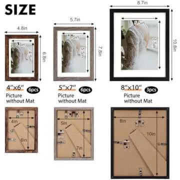 Fixwal Picture Frames Set, 15 Pack Wall Frame Set in 3 Different Finishes with Mat for Multiple Sizes Photos, Three 8x10, Six 5x7, Six 4x6 for Wall Gallery Decor, Hanging or Tabletop Display