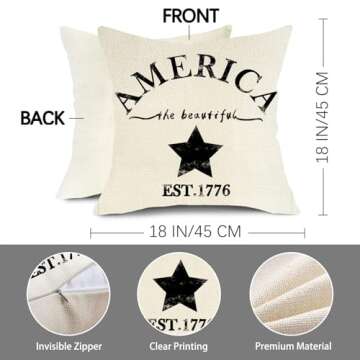 Show moreBring home the essence of patriotism with the Fjfz July 4th Farmhouse Decorative Throw Pillow Cover. This exquisite 18 x 18-inch cushion cover is designed to transform your home into a stylish celebration of American heritage. Crafted from 100% cotton linen, it features a unique star design and the motivational words "America, the Beautiful, EST. 1776" precisely printed on a single side. Perfectly suitable for decorating your living room, bedroom, or outdoor spaces, this pillow cover adds a touch of rustic charm to any setting while showcasing your national pride.